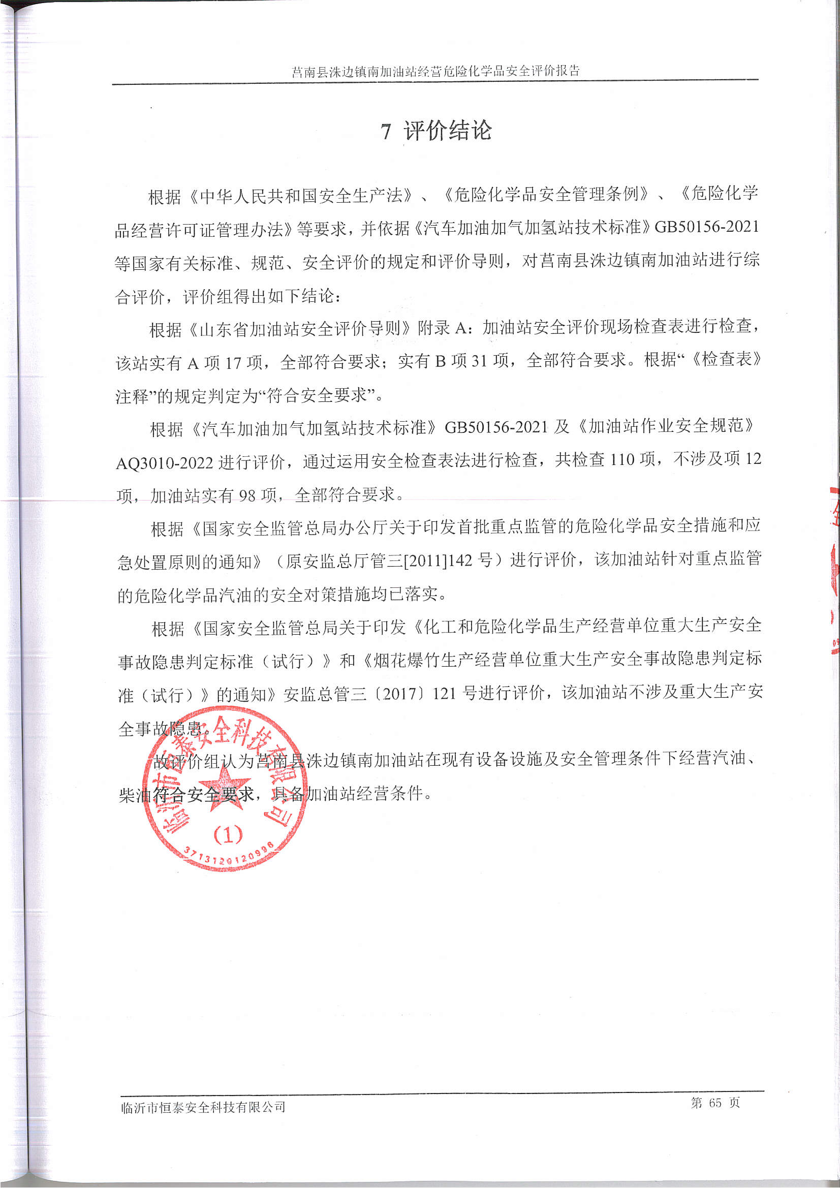 莒南县洙边镇南加油站经营危险化学品安全现状评价 |
